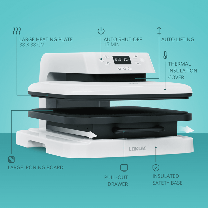 Entfesseln Sie Ihre Kreativität mit der LOKLiK Auto Heat Press! Dieses innovative Gerät ermöglicht es Ihnen, mühelos Wärmeübertragungen auf all Ihren Lieblingsstoffen anzuwenden. Perfekt zum Personalisieren von T-Shirts, Taschen und vielem mehr. Egal, welches Produkt Sie gestalten möchten, mit den vier voreingestellten Modi, zwei benutzerdefinierten Voreinstellungen oder dem Automatikmodus für Serienproduktionen finden Sie immer die richtigen Einstellungen. Die LOKLiK Auto Heat Press garantiert beeindruckende Ergebnisse mit minimalem Aufwand.