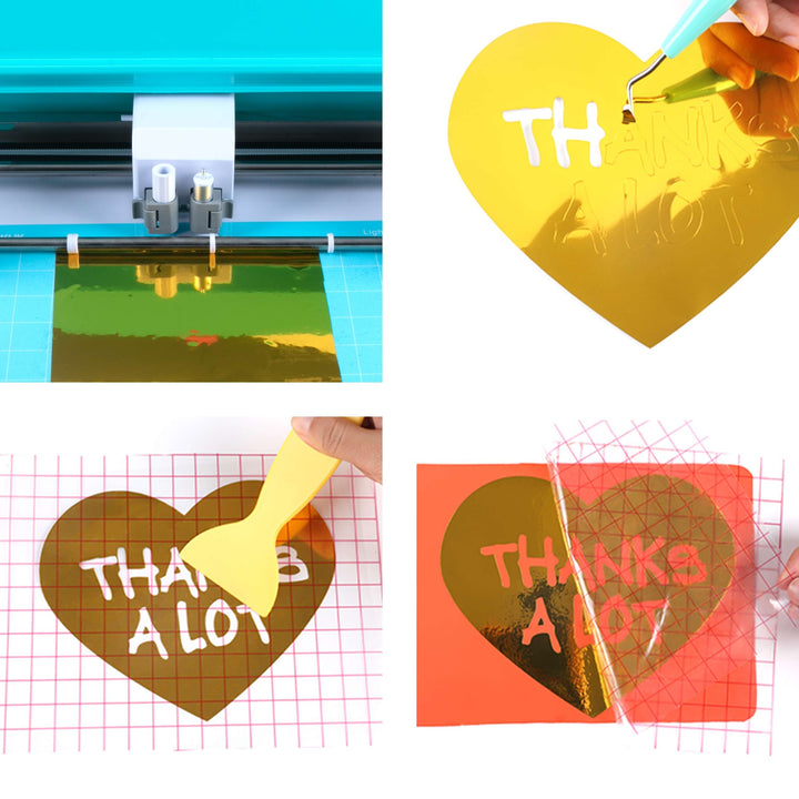 Um das Vinyl zu verwenden, entfernen Sie die klare Schutzfolie, legen Sie das Vinyl mit der metallischen Seite nach oben auf Ihre Schneidematte und schneiden Sie Ihr Design mit Ihrer bevorzugten Schneidemaschine. Entfernen Sie überschüssiges Vinyl, bringen Sie Transferfolie über Ihr Design an und verwenden Sie einen Schaber, um Blasen zu beseitigen. Übertragen Sie schließlich Ihr Design auf die gewünschte Oberfläche und ziehen Sie die Folie ab.