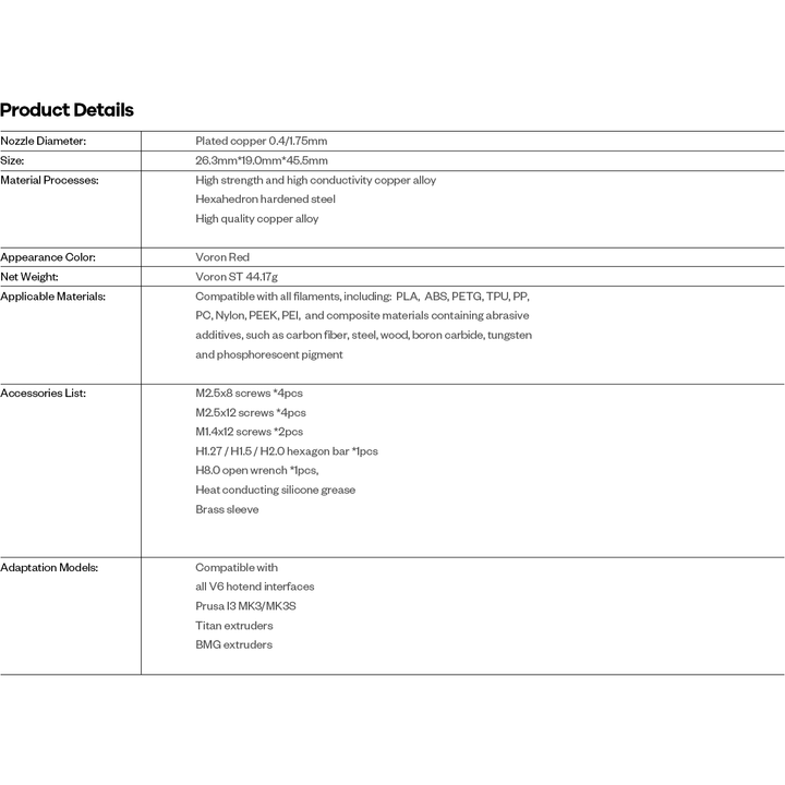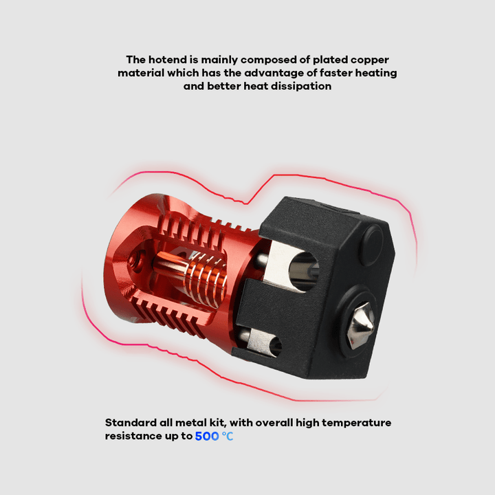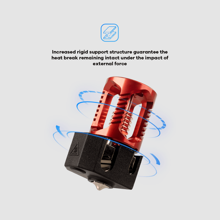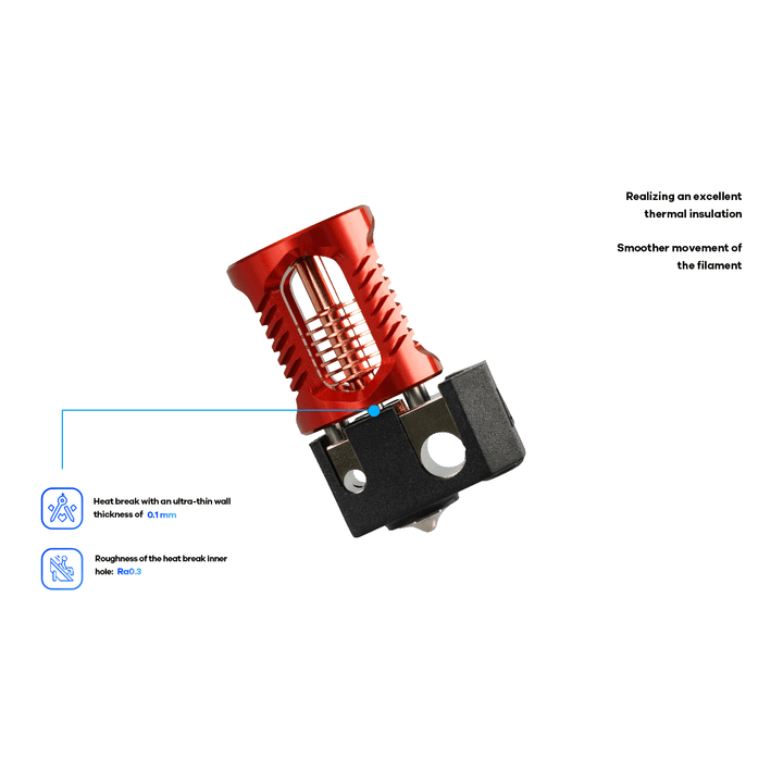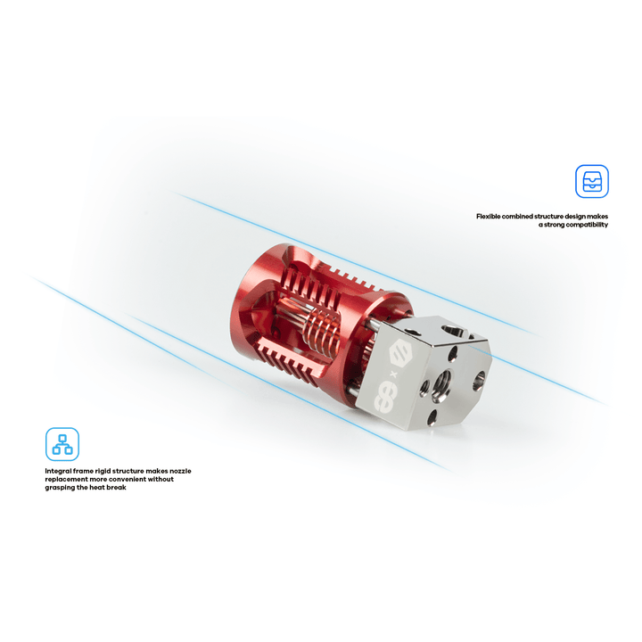 Mit einem 0,1 mm Titan-Heatbreak und einem Kupferlegierungskern bietet der Dragon ST das ideale Gleichgewicht zwischen schneller Erwärmung und hervorragender thermischer Isolation. Der robuste Rahmen ermöglicht schnelle Düsenwechsel, ohne den Heizblock berühren zu müssen – für einen reibungslosen Workflow.