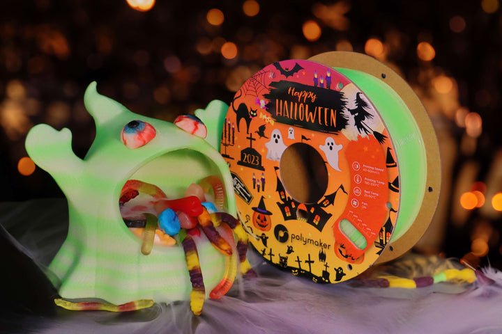 Um ein zusätzliches Element des Spaßes und der Überraschung hinzuzufügen, haben wir unser Slime Glow Green-Filament aus der PolyLite™ Gradient Color-Serie integriert. Dieses Leuchten-im-Dunkeln-Feature verleiht Ihren Halloween-inspirierten Designs einen bezaubernden Glanz und macht sie unvergesslich.