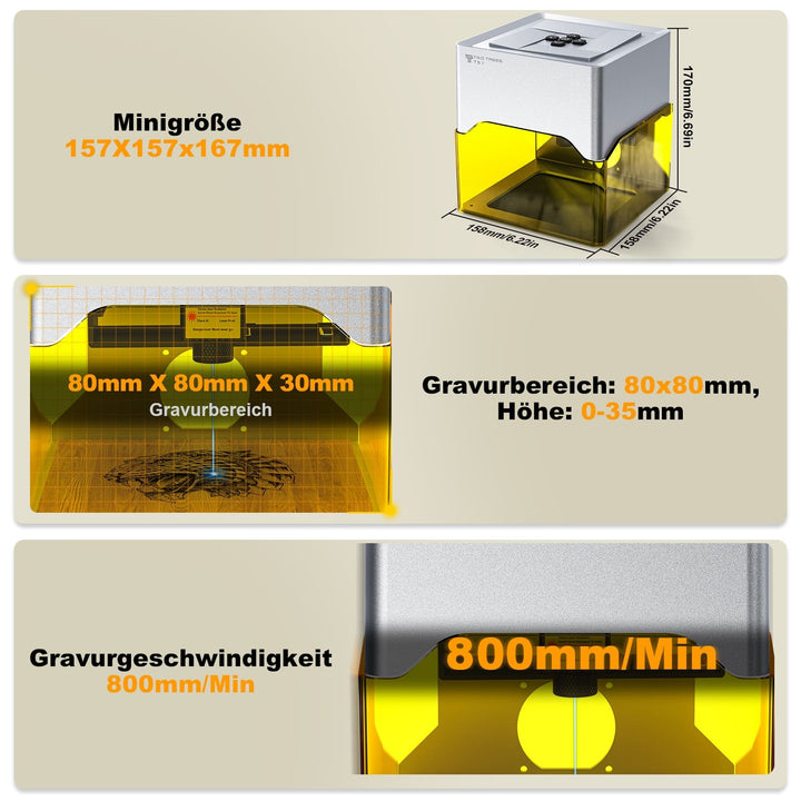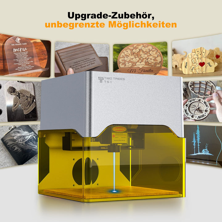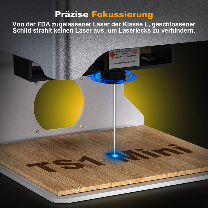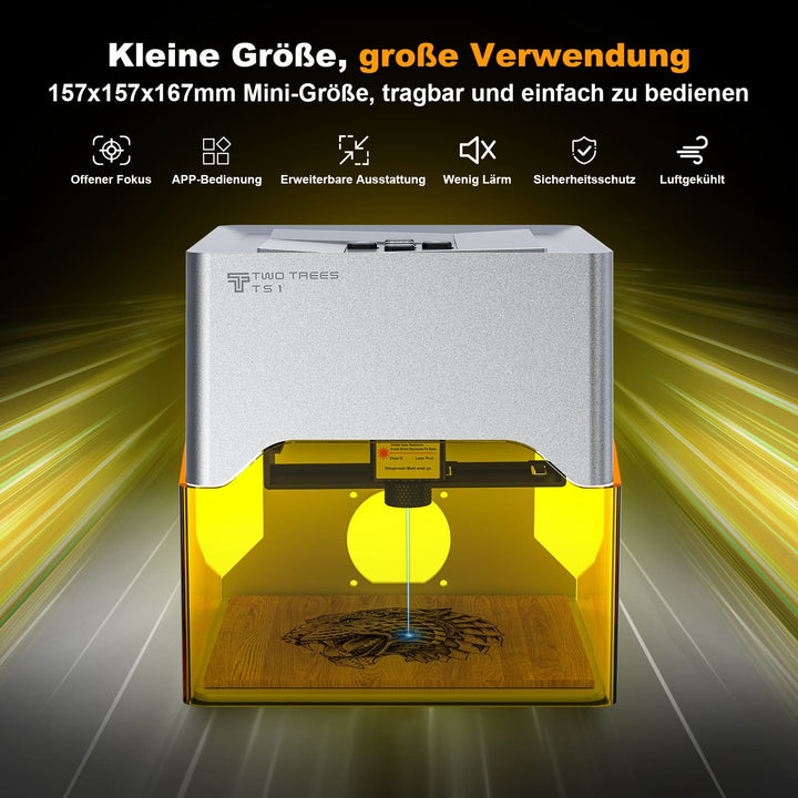 Med sin 455 nm blå laser skapar TS1 Mini knivskarpa gravyrer på en mängd olika material som trä, läder, akryl, kartong eller belagt metall. Arbetsområdet på 100 × 100 mm är optimalt för personliga unika föremål, etiketter, hängen eller småserier med fin detaljrikedom.